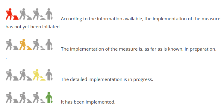 The degree of implementation is shown in four different phases: ‘Implementation not yet started’ – ‘Implementation started/in preparation’ – ‘Implementation well advanced’ – ‘Implemented’.